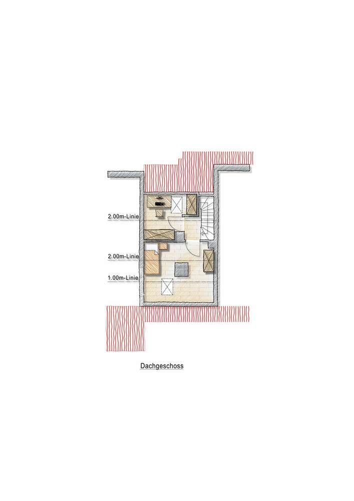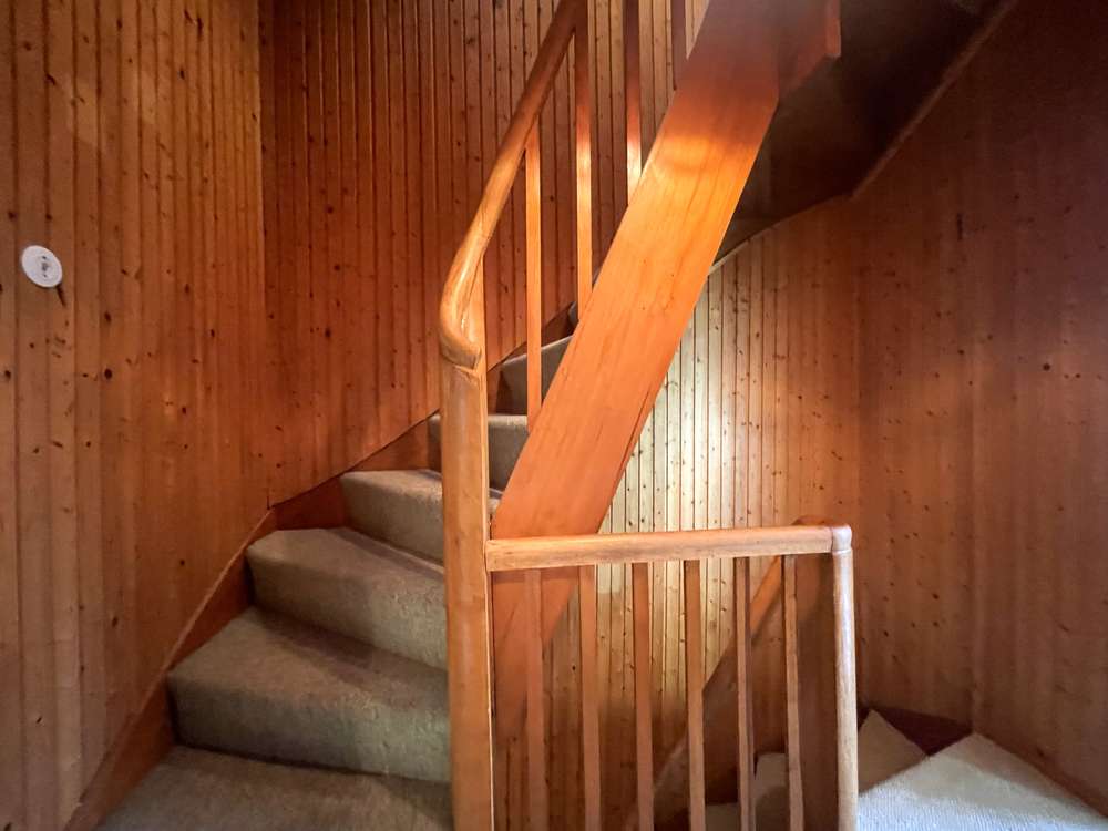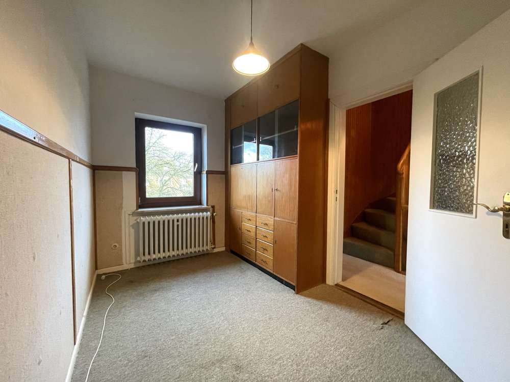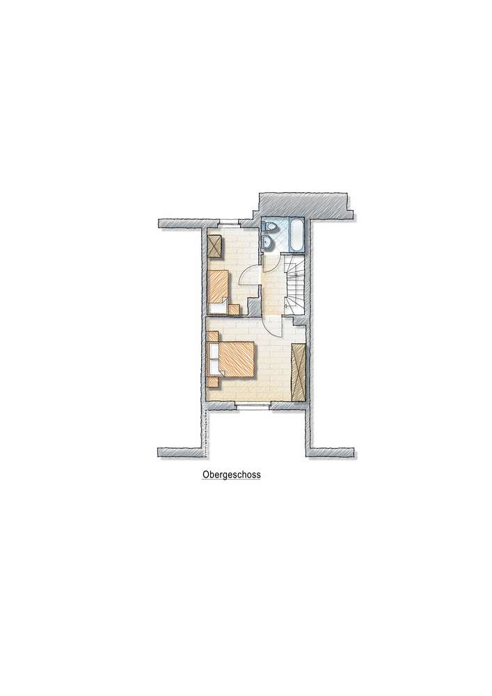 Eine hübsche Holztreppenanlage führt in das Obergeschoss, bestehend aus zwei Zimmern und einem kleinen Bad. Sofern ein größeres Bad gewünscht wird, wäre ein Umbau des kleineren Zimmers denkbar.