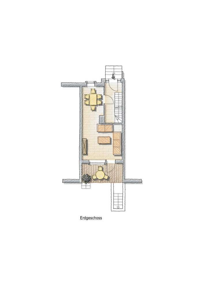 Das Reihenhaus bietet im Erdgeschoss einen gemütlichen Wohn-/Essbereich. Aktuell befindet sich die Küche im Keller. Es würde sich anbieten, die Küche in den Essbereich zu verlegen und zum Wohnbereich offen zu lassen. Vom Wohnzimmer gelangen Sie auf die Terrasse mit West-Südwestausrichtung sowie in den kleinen Garten.