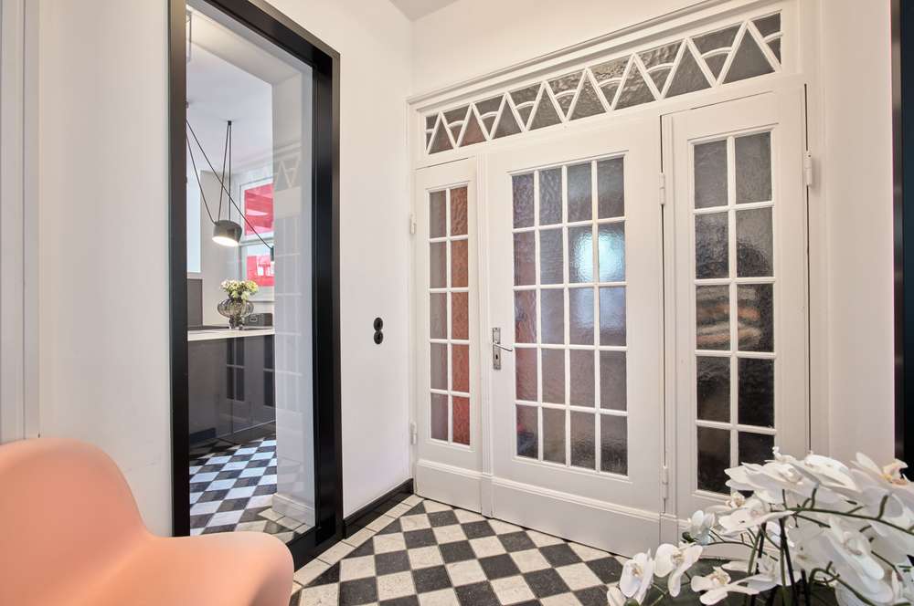 Über den Seiteneingang mit Windfang gelangen Sie zunächst in die Diele mit den hübschen Schachbrettmuster-Fliesen. Sehr durchdacht sind die bodentiefen Glaselemente, wodurch besondere Blickachsen entstanden sind. Zum Vorgarten gelegen, befinden sich die ineinander übergehenden Wohnbereiche, wobei der hintere über einen Kamin verfügt.