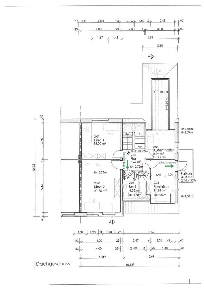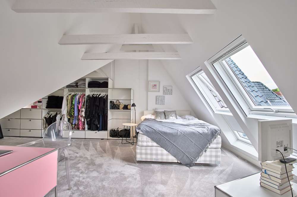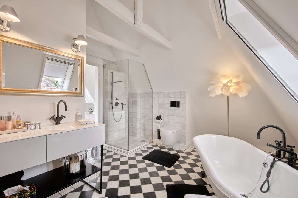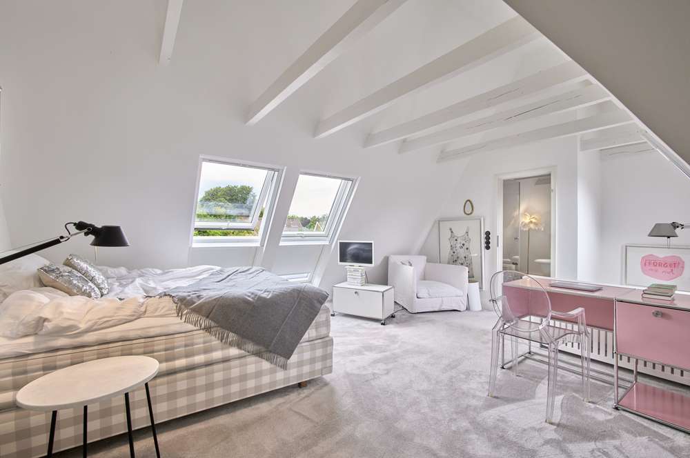Eine repräsentative Holztreppenanlage führt in das Obergeschoss. Die Aufteilung besteht aus drei Schlafzimmern, wovon eines über einen kleinen Balkon verfügt, sowie ein Badezimmer. Im ausgebauten Dachgeschoss finden Sie ein weiteres Bad und einen sehr schönen und überaus hellen Raum zur individuellen Nutzung vor.